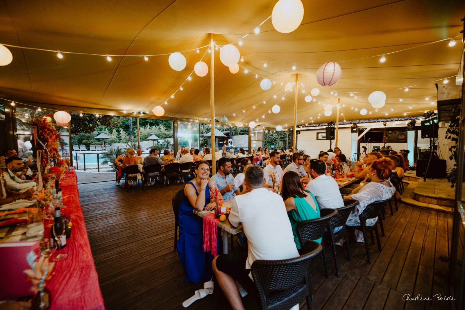 - Mise à disposition d’une cuisine professionnelle, de la vaisselle, du mobilier, d’une chambre froide, d’un bar, d’une tireuse à bière, d’une terrasse de réception de 180 m2, couverte par une toile de tente, se fermant par des portes coulissantes amovibles, d’un espace couvert par une autre toile de tente, dédié à la cérémonie laïque avec terrasse en bois et chaises